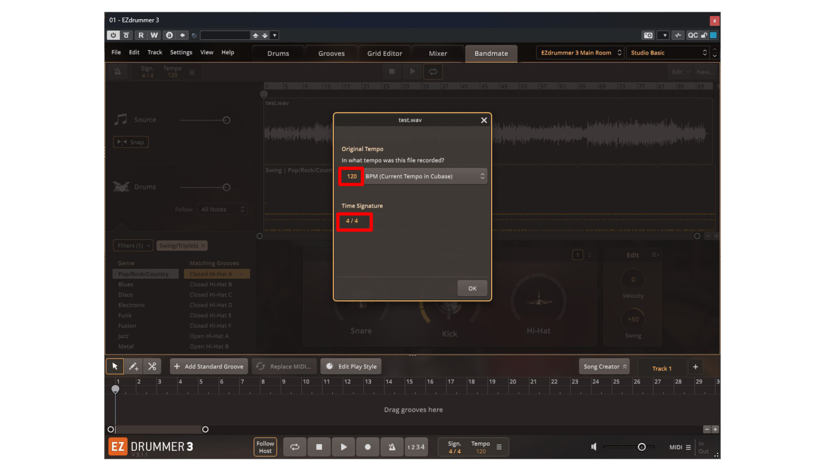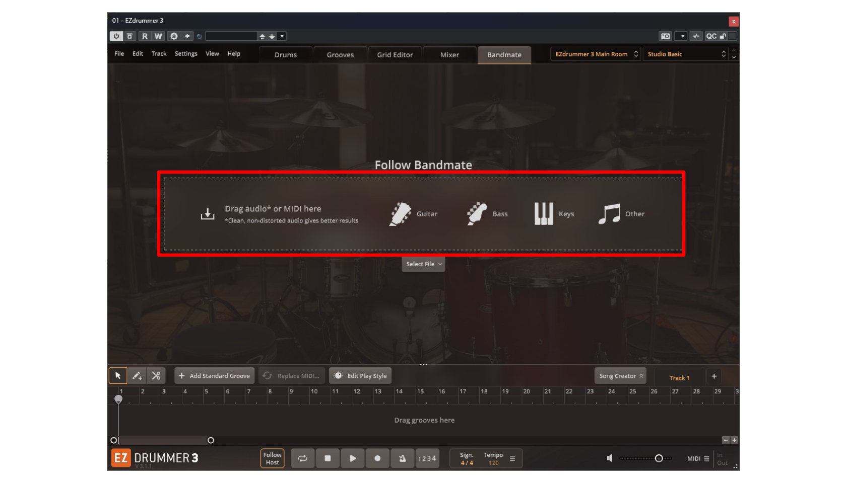 まずはBandmate画面を開いて、あなたのギターリフや鼻歌のオーディオファイル or MIDIファイルを、ドラッグ&ドロップ!