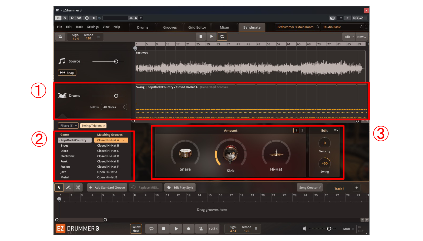 解析が終わると、①AIがあなたのフレーズに合うドラムパターンを提案してくれます。②のリストから他の候補を選ぶことも可能です。③選んだパターンに対して、キック / スネア / ハイハットの手数やベロシティ(叩く強さ)、スウィング具合を調整して、より好みのパターンに仕上げることもできます。