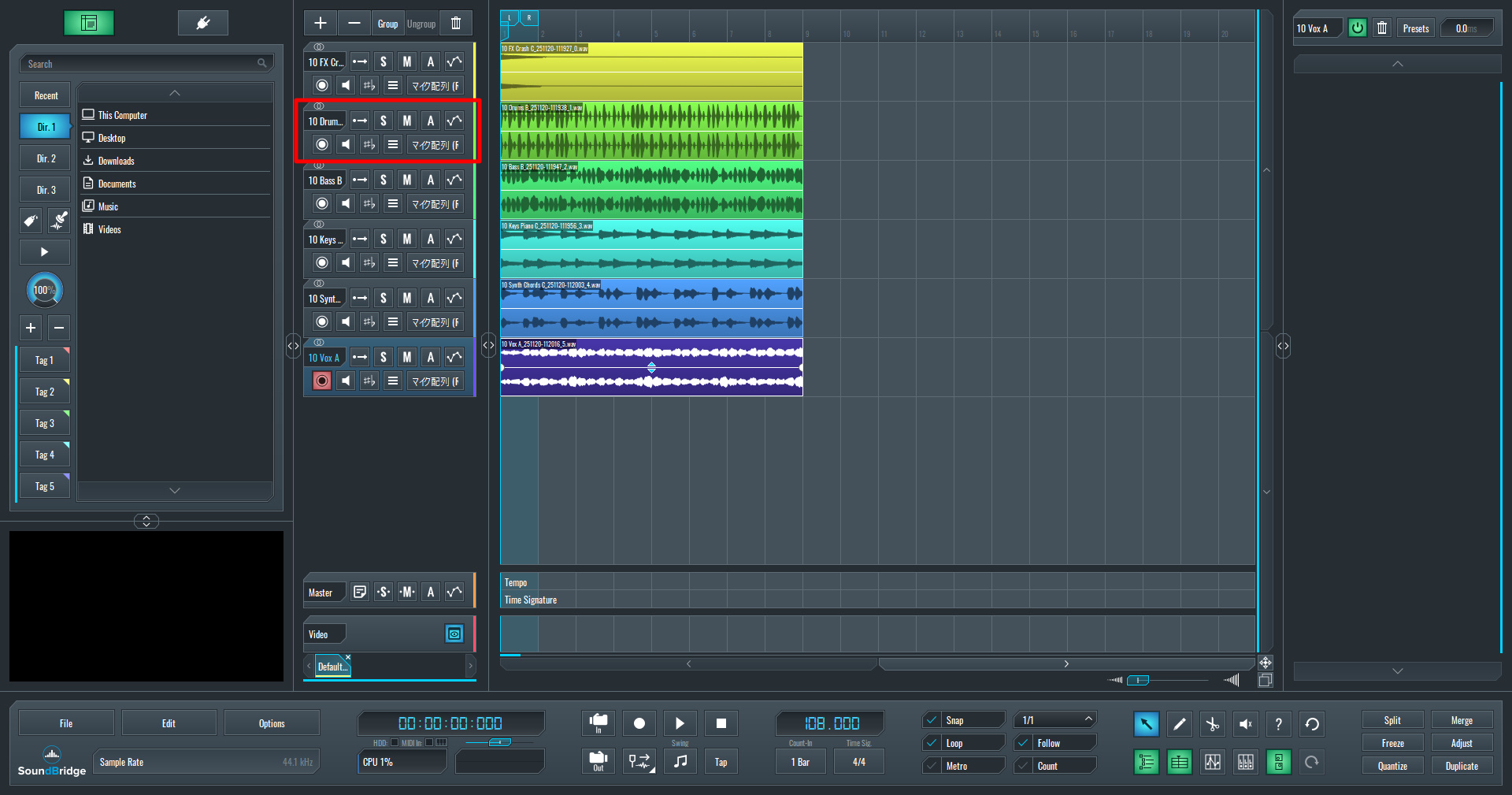 代わりに、同じ「10 108 Gm」フォルダ内にある「Drum Hits」フォルダの中から、以下のファイルを『SoundBridge』にドラッグ&ドロップします。