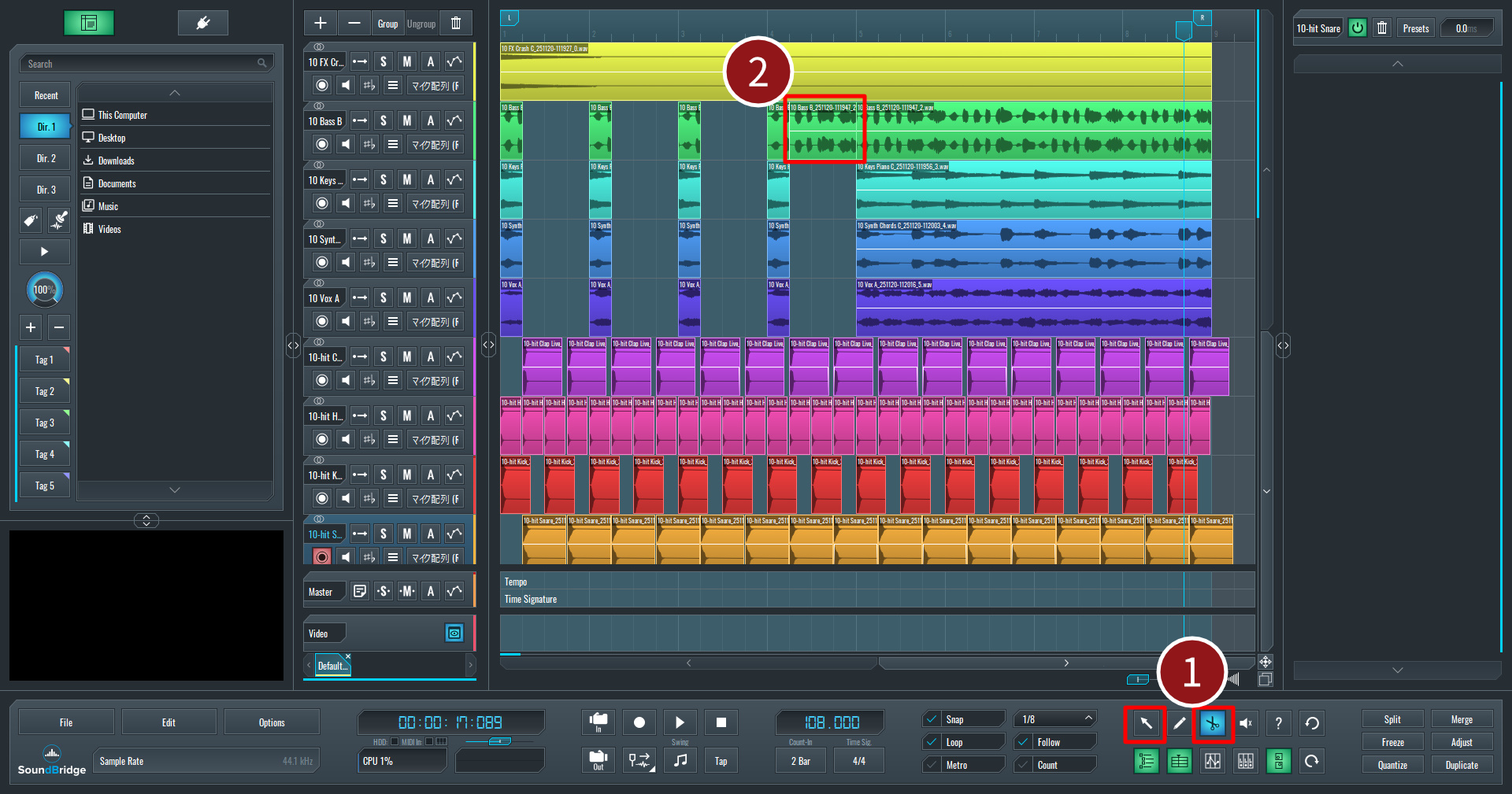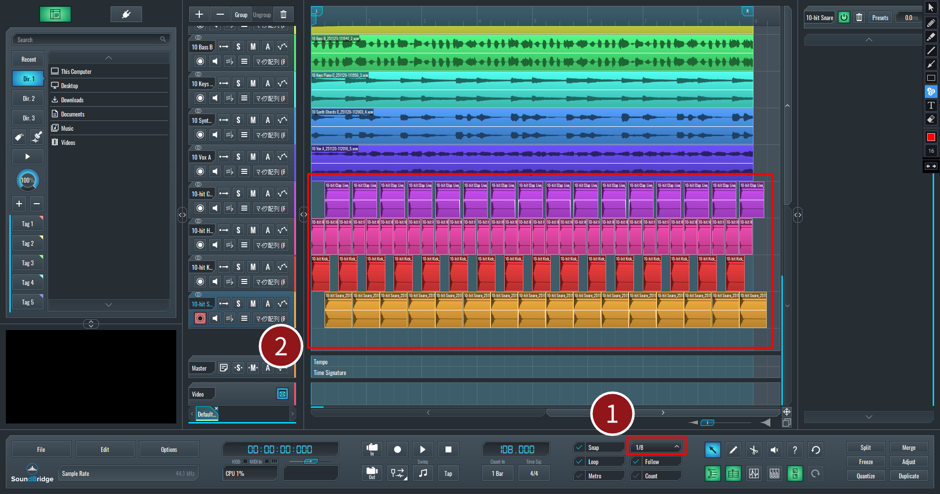 『SoundBridge』は標準でグリッド(縦の線)に沿って配置されるようになっているため、タイミングを合わせやすく、リズムがずれにくく安心です。今回は、画面下部(画像赤枠①)の設定を「1/8」に変更し、グリッドの間隔を八分音符に合わせます。