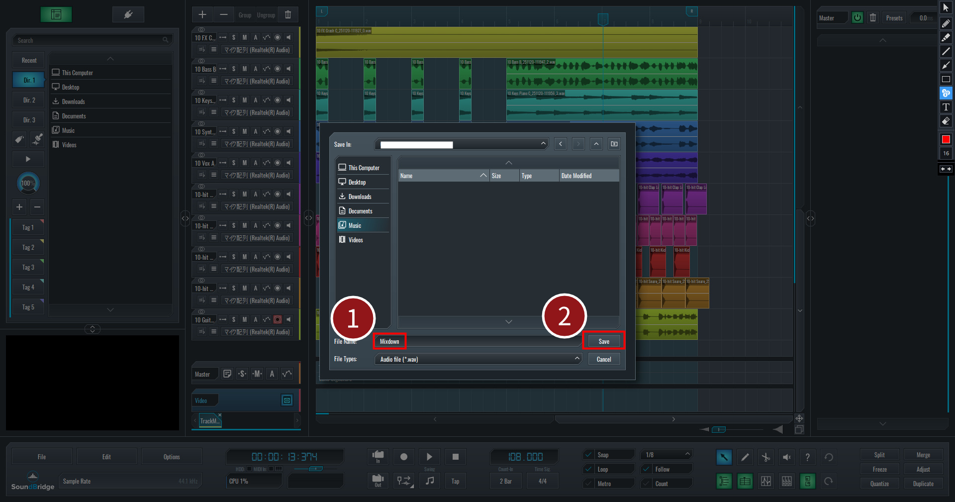 - ① File Name: ファイル名(例: “Mixdown”などわかりやすいもの)を入力します。