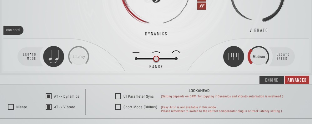 [ Main ]ページで[ DYNAMICS ]レンジの設定を0%~200%に設定できるところがこの音源の特徴的な部分だと感じます。歌もののポップスなどに対して、ストリングスのラインをなるべく聞こえやすいようにレンジを低めに設定したり、繊細なダイナミクスを聞かせたいオーケストラ楽曲へは高めに設定したりすることが気軽にできる、というところが面白いポイントです。