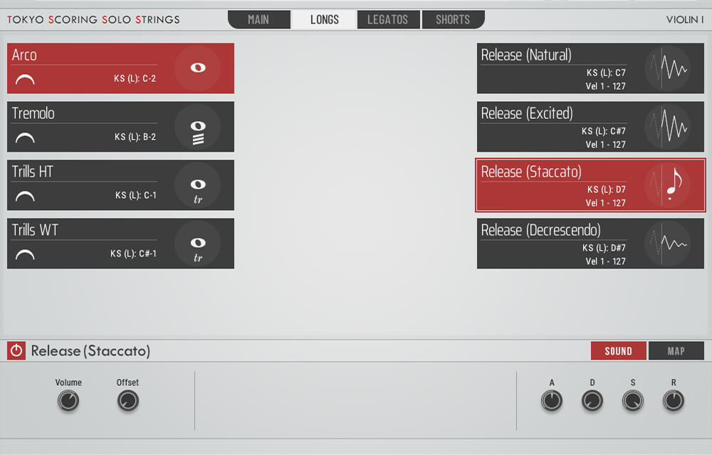 [ LONGS ]パッチに「Release」サンプルが4種(「Natural」、「Excited」、「Staccato」、「Decrescendo」)付属しているため、曲の雰囲気に合わせてカスタマイズすることができます。よりドライな音で他音源とのミックスを調整していきたい場合は「Release(Staccato)」を選択することで、余韻をかなり短くすることができるためこの音源の収録環境の影響を減らして使用することができます。逆に音源の質感を活用したい場合は「Release(Decrescendo)」にすると良さそうです。