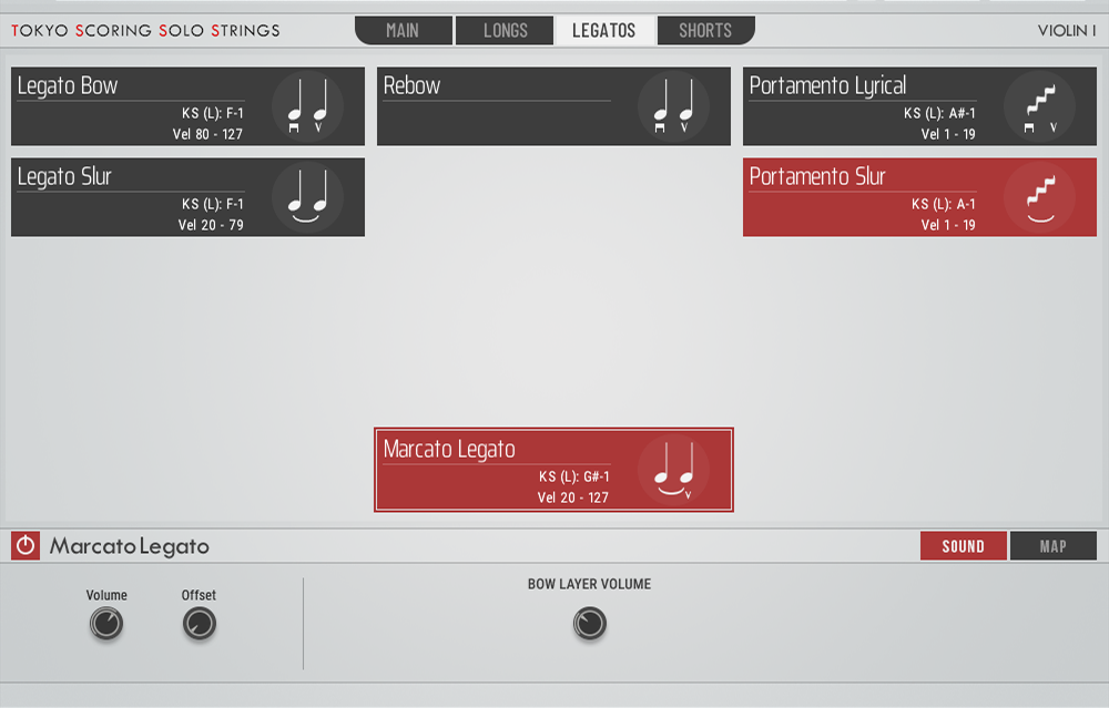 レガートの打ち込み方は非常にシンプルで、単純にノートを重ねるだけとなっており、割り込む側のベロシティによってレガート、ポルタメント、スラー等が自動的に選択されるシステムとなっていて非常に手軽です。もちろんキースイッチで「Rebow」や「Marcato Legato」を指定選択する事も可能です。レガート奏法については特に低弦側の収録されている音源の表現力が大変美しく、素晴らしい。