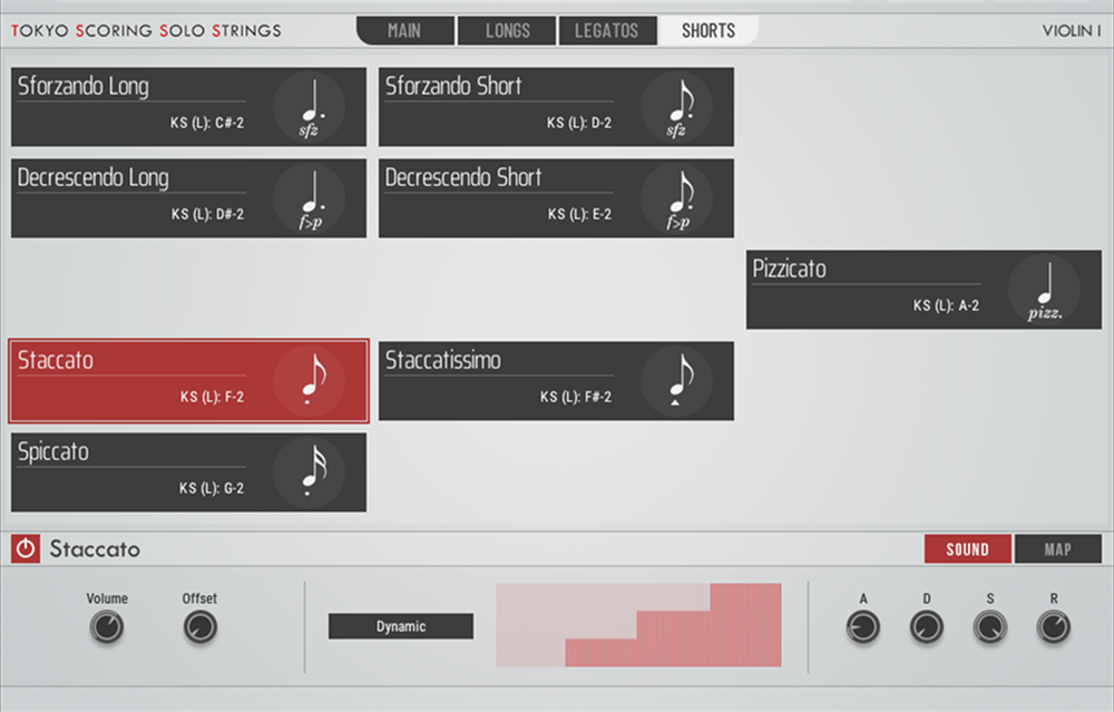 「Sforzando Long」「Sforzando Short」「Decrescendo Long」「Decrescendo Short」「Staccato」「Staccatissimo」「Spiccato」「Pizzicato」が収録されています。ソロ音源の場合、細かなニュアンスの変化を加えていくことが生演奏らしさにつながるため、これらを駆使して打ち込みを行っていくことでより表現力の高いトラックを制作することができます。またエンベロープも編集可能です。特に「Release」はショート系パッチのノリに大きく影響する部分で、これを編集することで楽曲のテンポに合わせてショート系パッチを活用することができます。