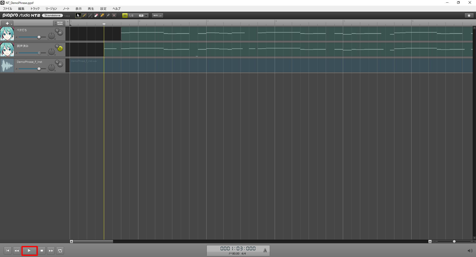 成功すると以下のような画面となります。画面左下にある再生ボタンか、キーボードのスペースキーを押すことで、入力されているデモフレーズを再生できます。再生してみましょう!