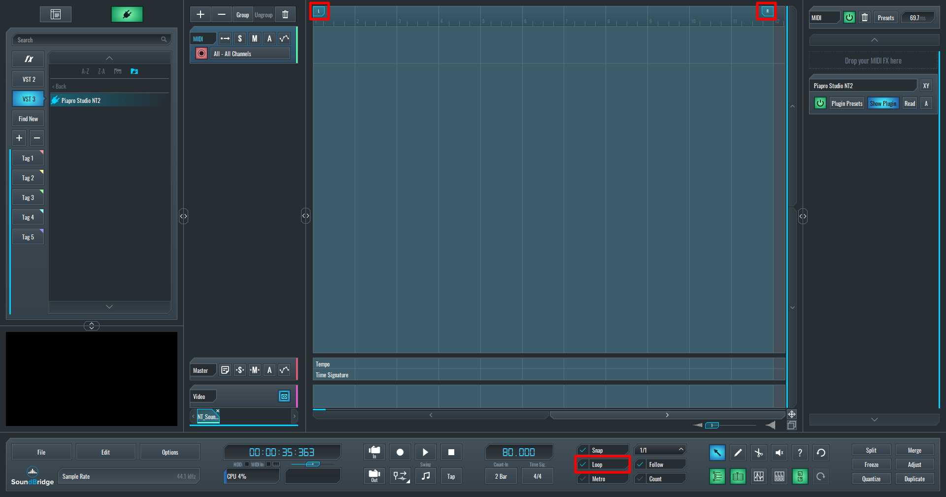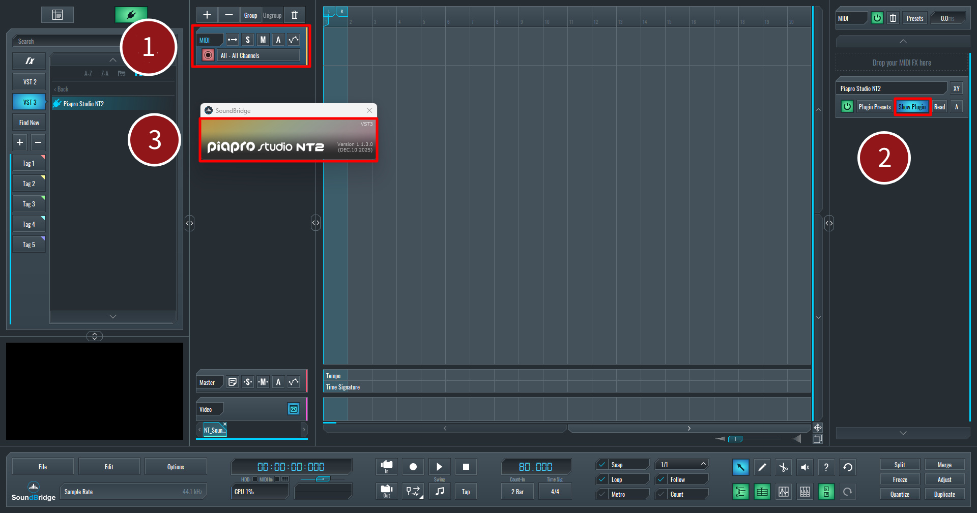 以下赤枠で囲われた[Show Plugin]ボタン(プラグインウィンドウを表示するボタン)をクリックすると、『Piapro Studio NT2』の画面が表示されます。