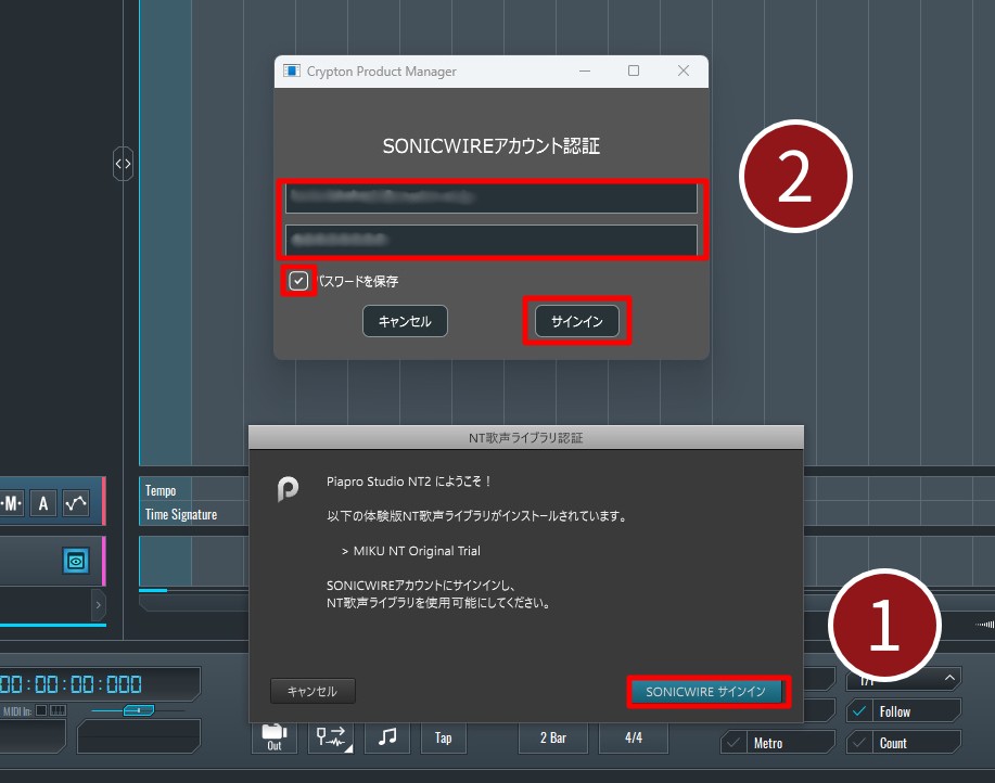 - ① 「NT歌声ライブラリ認証」ダイアログ内の[ SONICWIRE サインイン ]をクリックします。