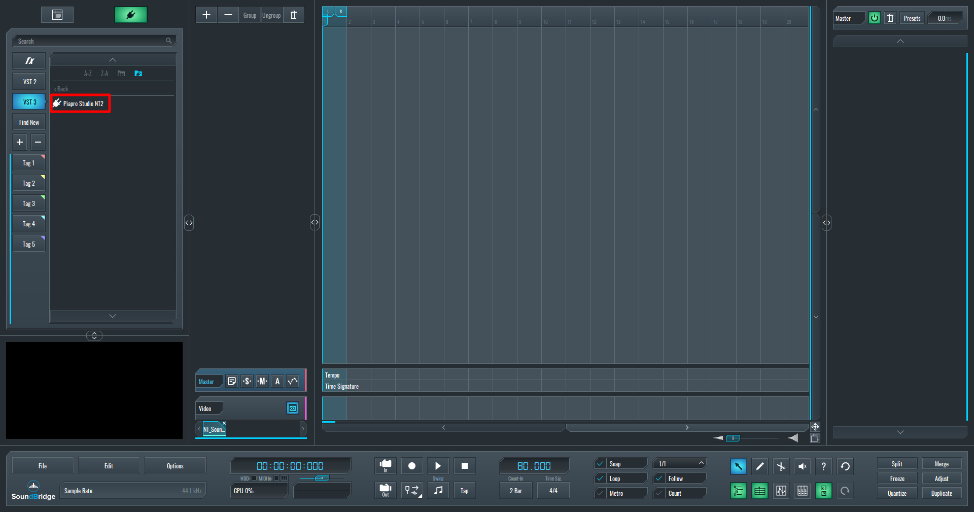 設定が終わったら、画面左側のブラウザにある [ VST 3 ] をクリックし、[ Instrument|Synth ] > [ Piapro Studio NT2 ] の順にクリックします。