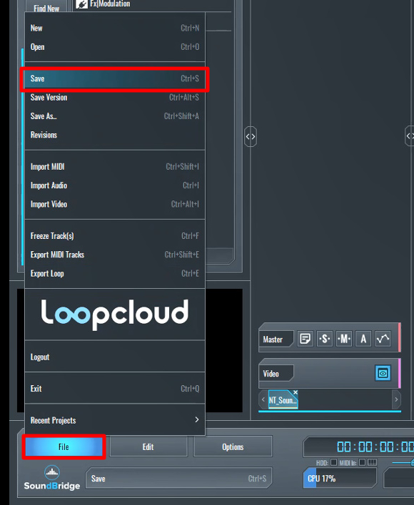 『SoundBridge Free』画面左下の [ File ] をクリックし、メニューから [ Save ] を選択します。