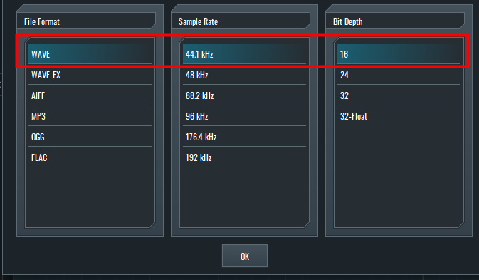 - Bit Depth: ビット数を選びます。「16」が一般的です。