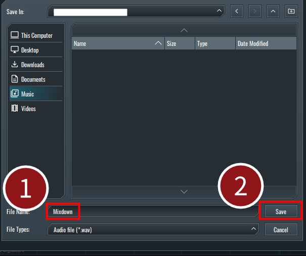 - ① File Name: ファイル名(例: “Mixdown”などわかりやすいもの)を入力します。