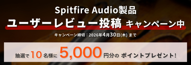 - キャンペーン内容:期間中にSpitfire Audio製品のユーザーレビューを投稿された方の中から、抽選で10名様にSONICWIREポイント5,000円分(5,000ポイント)をプレゼント。