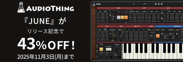 【AudioThing】シンセサイザーの名機を実機さながらに再現した音源『JUNE』がリリース記念で43%OFF! - 2025.11.03まで