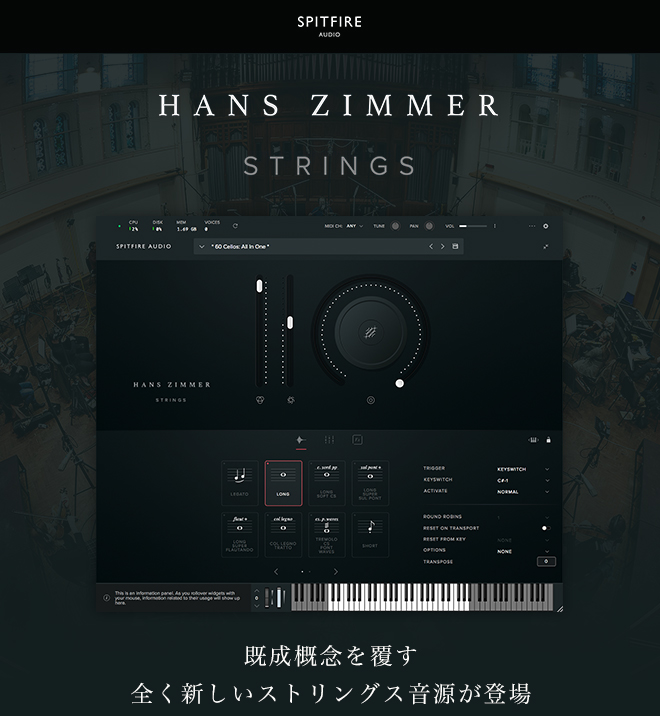 ハリウッド映画音楽の巨匠“Hans Zimmer(ハンス・ジマー)”とSpitfire Audioが手を組んで生み出した、新次元ストリングス音源です。344名の奏者と、ロンドンが世界に誇るレコーディング・スタジオ「AIR Studios」、そしてテクノロジーが高度に絡み合い、途方もないスケール感のアンサンブルを実現します。 | ||