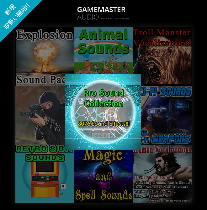 アラーム、ボタンといった基本的なサウンドはもちろん、銃、動物、足音、SF、打撃、武器、叫び声、魔法、爆発など、幅広いカテゴリの効果音を用意。小分けにされた各タイトルと、それらをバンドルした『PRO SOUND COLLECTION』を発売。 | ||