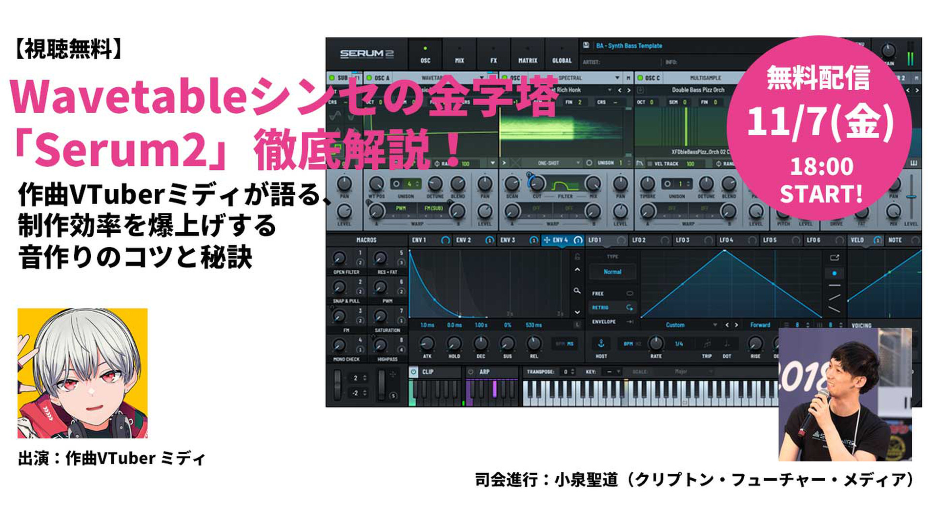 Vtuber「ミディ」によるシンセサイザー音源『SERUM 2』の使い方講座や、人気ギター系YouTuber「かずき」氏による『初音ミク NT』を使用した作曲チャレンジ動画、プロ作詞家「Mio Aoyama」氏による歌詞添削企画など、豪華ラインナップでお届けします。