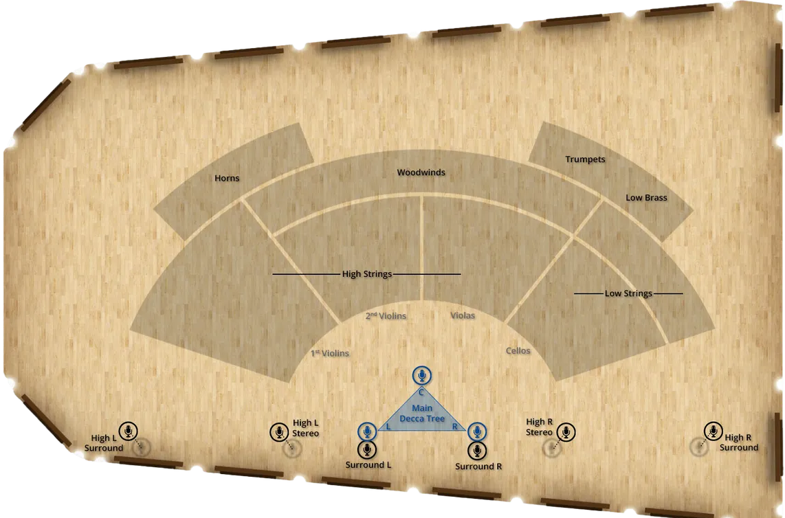 - デッカ・ツリー・マイクを用いた、オーケストラ収録のコアとなるマイク・セッティングです。メインのステレオ・チャンネルとモノラルのセンター・チャンネルで構成されており、指揮者の視点からホールの響きのディテールを捉えます。