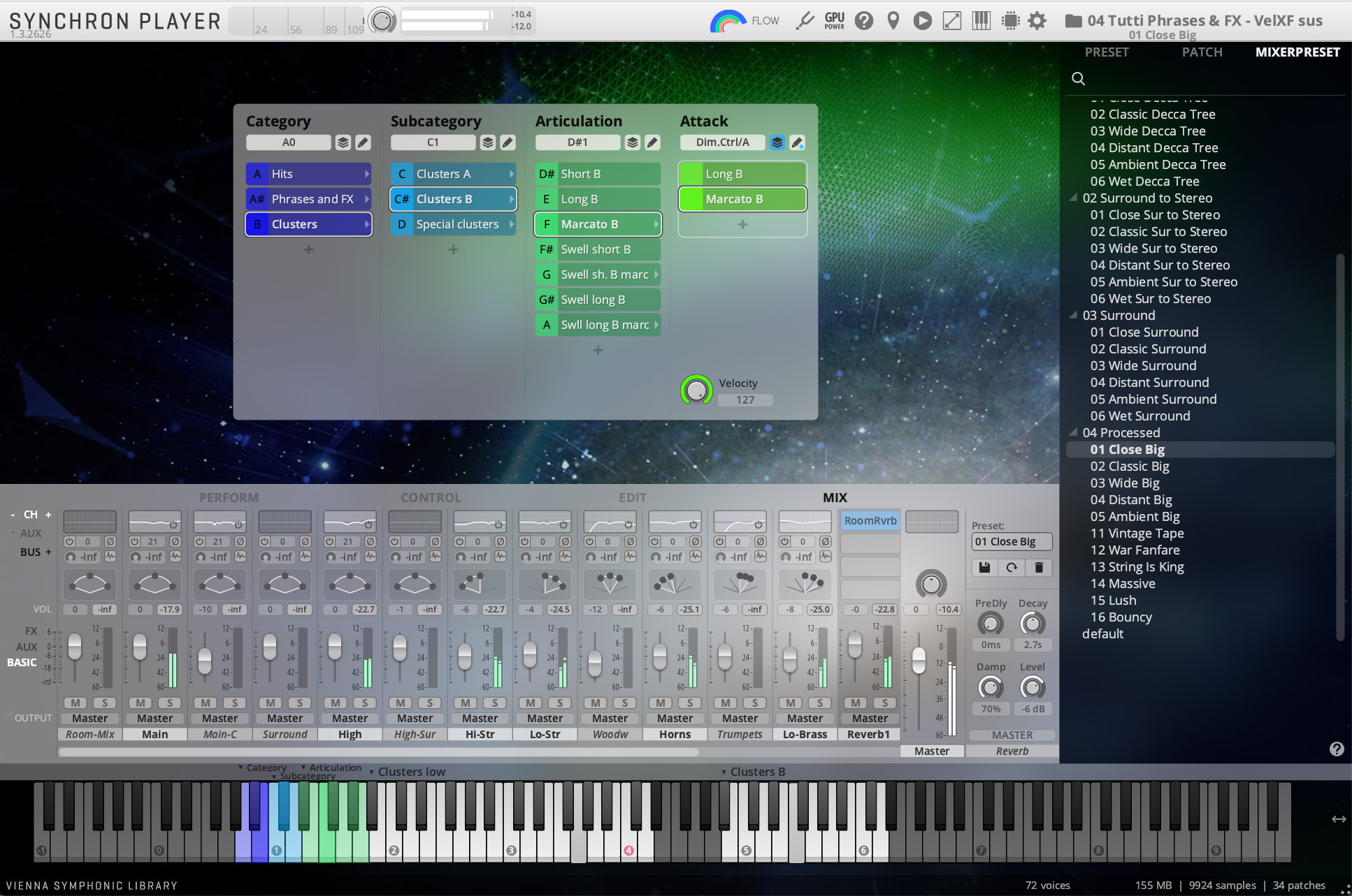 Synchron Playerでは、トゥッティ、セクション、またはそれらをミックスした構成を簡単に切り替えることができ、すべてのパッチが他のBig Bang Orchestraライブラリともシームレスに融合します。