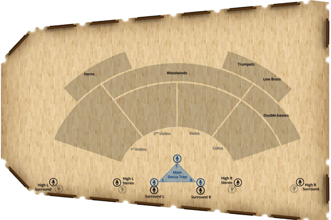 - デッカ・ツリー・マイクを用いた、オーケストラ収録のコアとなるマイク・セッティングです。メインのステレオ・チャンネルとモノラルのセンター・チャンネルで構成されており、指揮者の視点からホールの響きのディテールを捉えます。