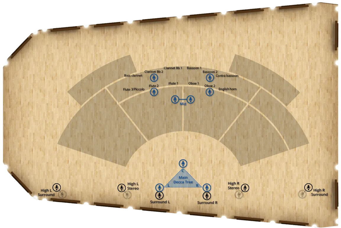 - デッカ・ツリー・マイクを用いた、オーケストラ収録のコアとなるマイク・セッティングです。メインのステレオ・チャンネルとモノラルのセンター・チャンネルで構成されており、指揮者の視点からホールの響きのディテールを捉えます。
