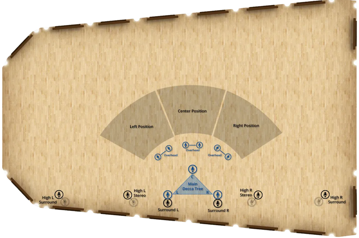 - デッカ・ツリー・マイクを用いた、オーケストラ収録のコアとなるマイク・セッティングです。メインのステレオ・チャンネルとモノラルのセンター・チャンネルで構成されており、指揮者の視点からホールの響きのディテールを捉えます。