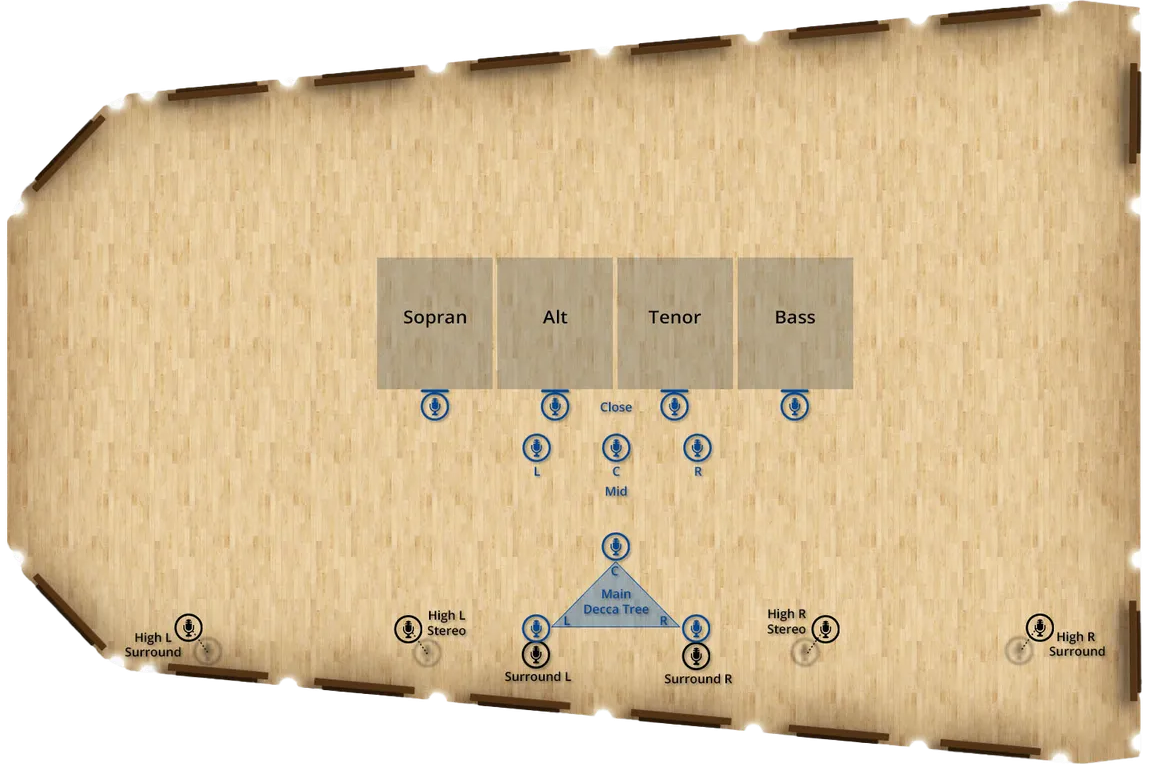 - デッカ・ツリー・マイクを用いた、オーケストラ収録のコアとなるマイク・セッティングです。メインのステレオ・チャンネルとモノラルのセンター・チャンネルで構成されており、指揮者の視点からホールの響きのディテールを捉えます。