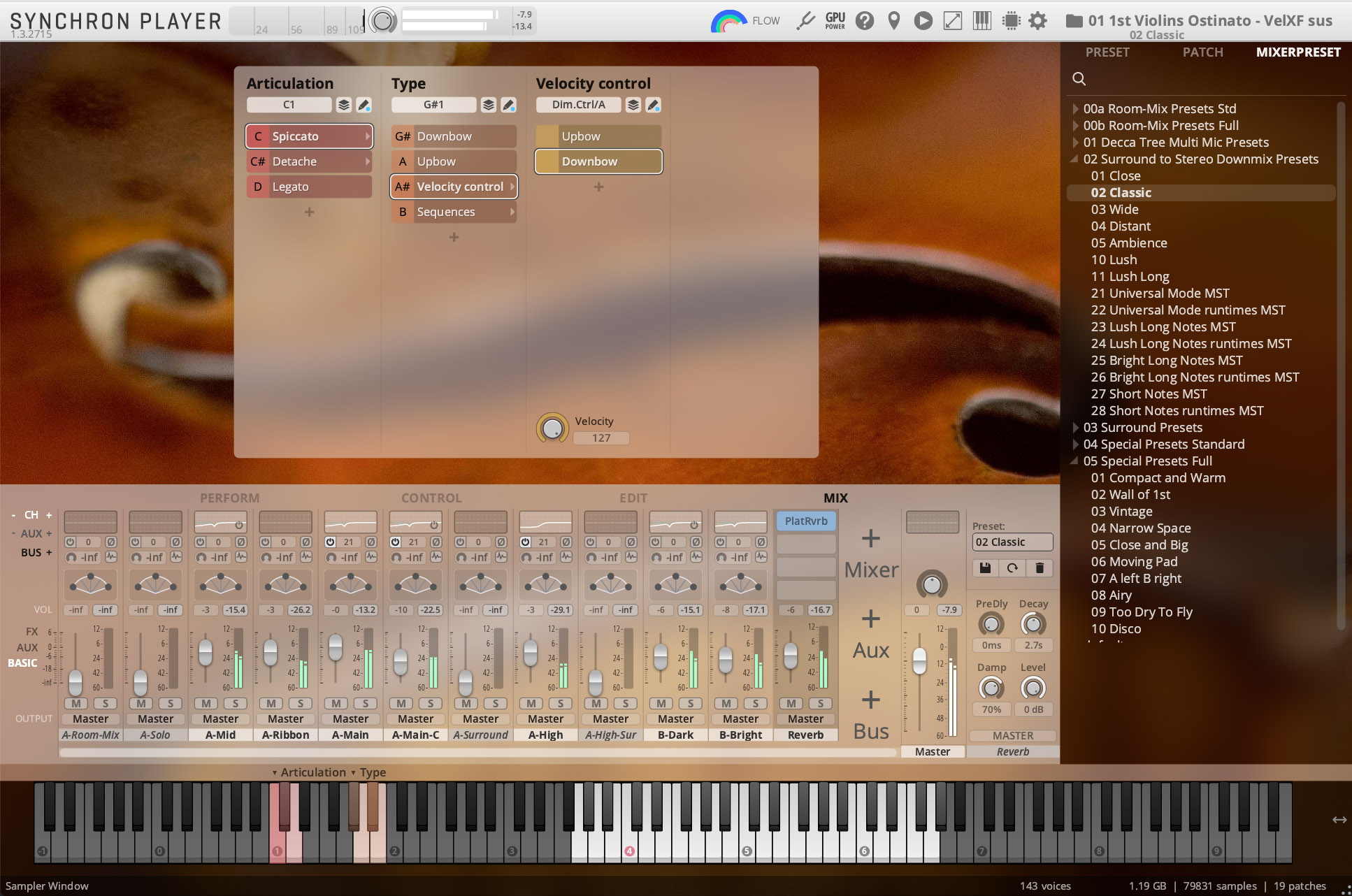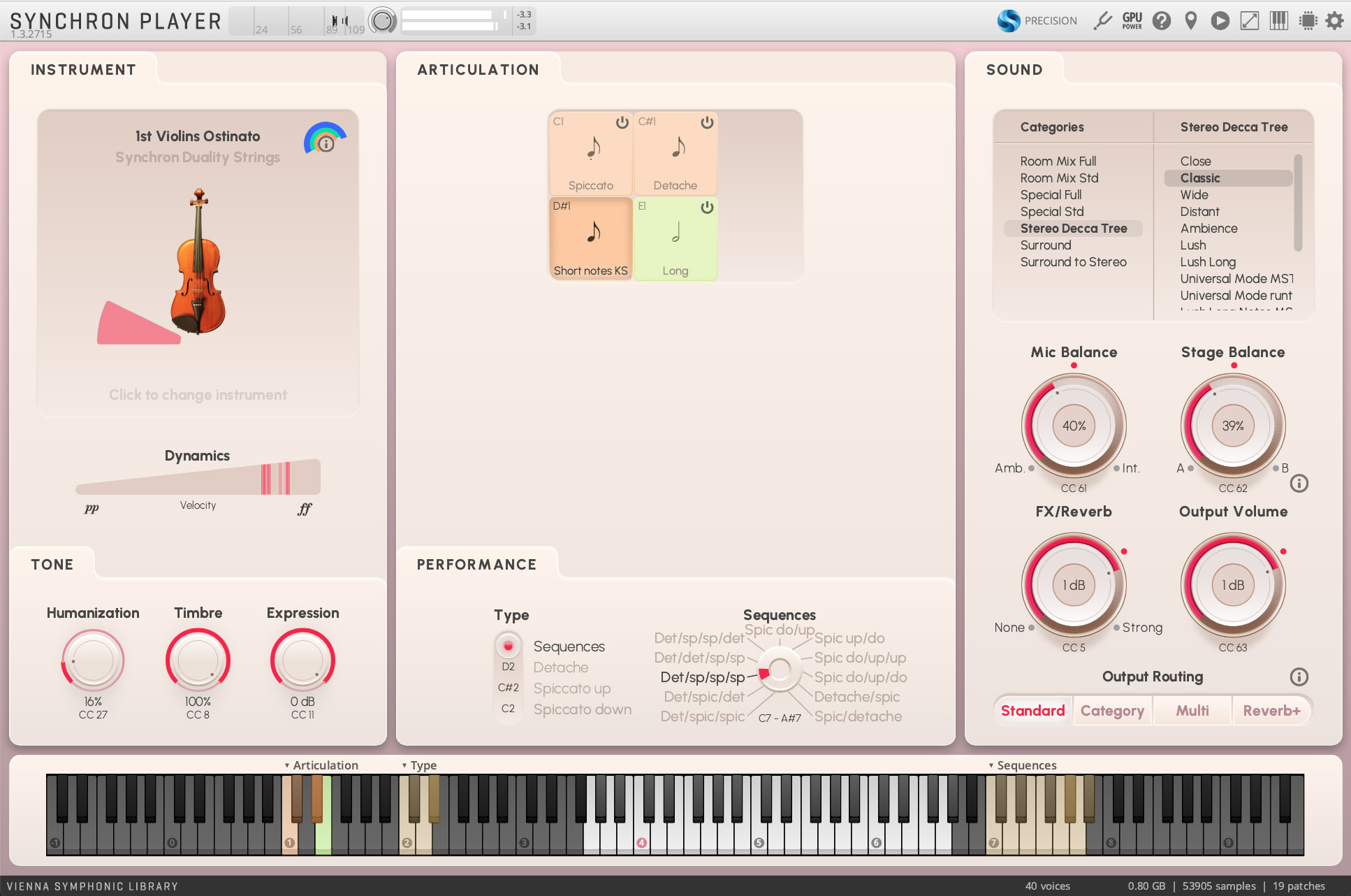 Vienna Synchron Playerのシーケンス機能を使用すれば、単純なオルタネート奏法から、スピッカートとデタシェを組み合わせた複雑なボウイングまで簡単に再現可能です。 また、別売の『Synchron Duality Strings (regular)』をお持ちの場合、スフォルツァート、トレモロ、トリル、ピチカート、ハーモニクスなどを統合したプリセットが利用可能になります。