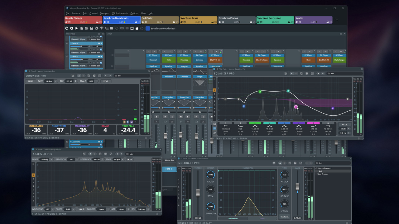 - 統合FXプラグイン:ミキサーチャンネルに表示可能な「Vienna Suite Pro」プラグイン(Compressor, Equalizer, Exciter, Limiter, Analyzer, Hybrid Reverb)を搭載。