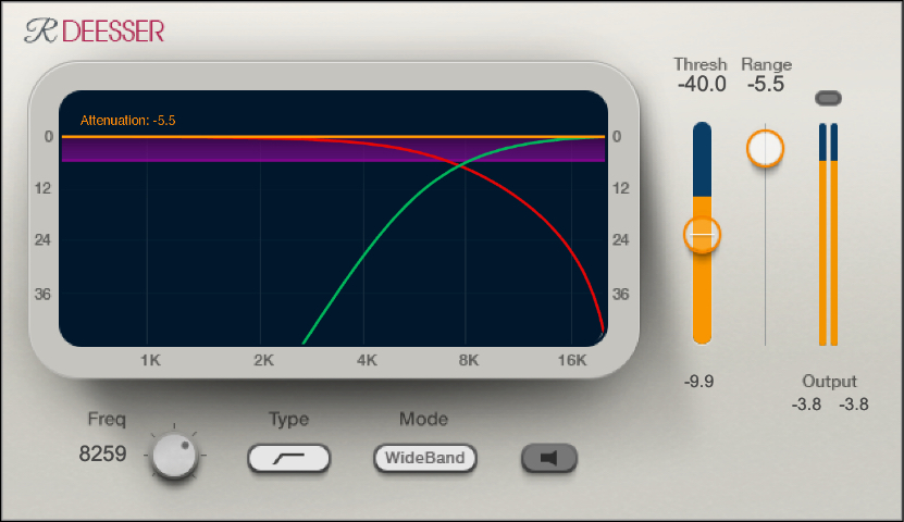位相補正用クロスオーバーは、通常コンプレッションを行った際に発生する好ましく無い音質変化や位相変調を除去します。同じタイプのクロスオーバーは、WavesのC1やC4コンプレッサーでも使用されています。また、Adaptive Thresholdは、入力された信号に対しコンプレッサーがダイナミックに適応し、よりナチュラルなサウンドを得られるスムーズなディエッシング効果を可能にします。