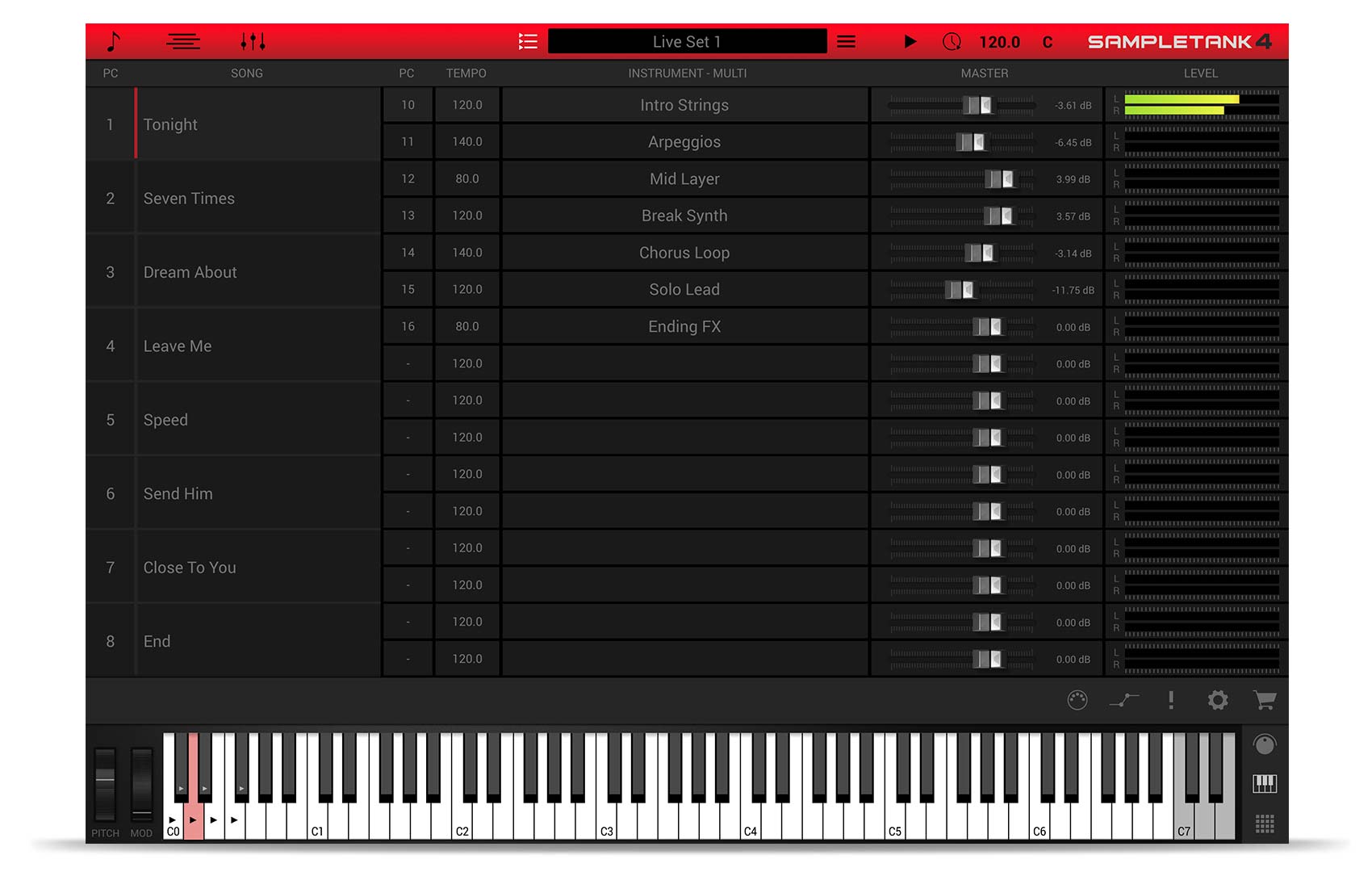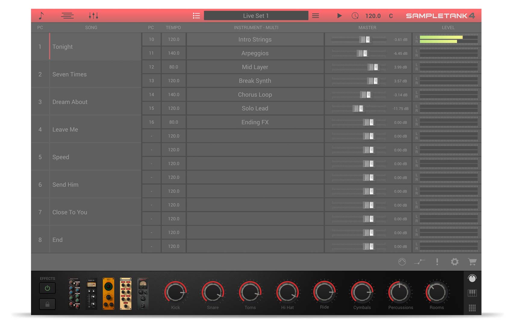 SampleTank 4のライブ・モードでは、ライブ・パフォーマンスのために、作成したソングをグループ化してひとまとめにしたセット・リストを構築できます。