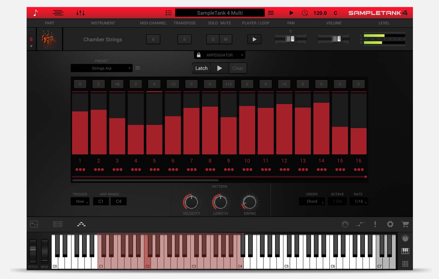 アルペジエーターにより、クリエイティブなパターンを作成できます。最大16ステップのパターンを作成し、各ベロシティ、長さ、スウィングなどを設定可能です。