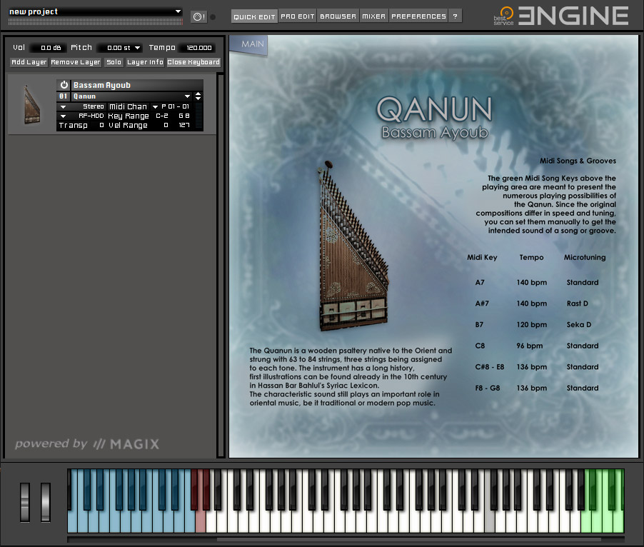 『Qanun』には、オリエンタル音楽において最も重要で使用頻度の高いマイクロ・チューニング(Bayati、Rast、Saba、Seka)が搭載されています。各チューニングには2つのバリエーション(Normal と Syriac Church)が用意されており、キー(調)を自由に選択することが可能です。