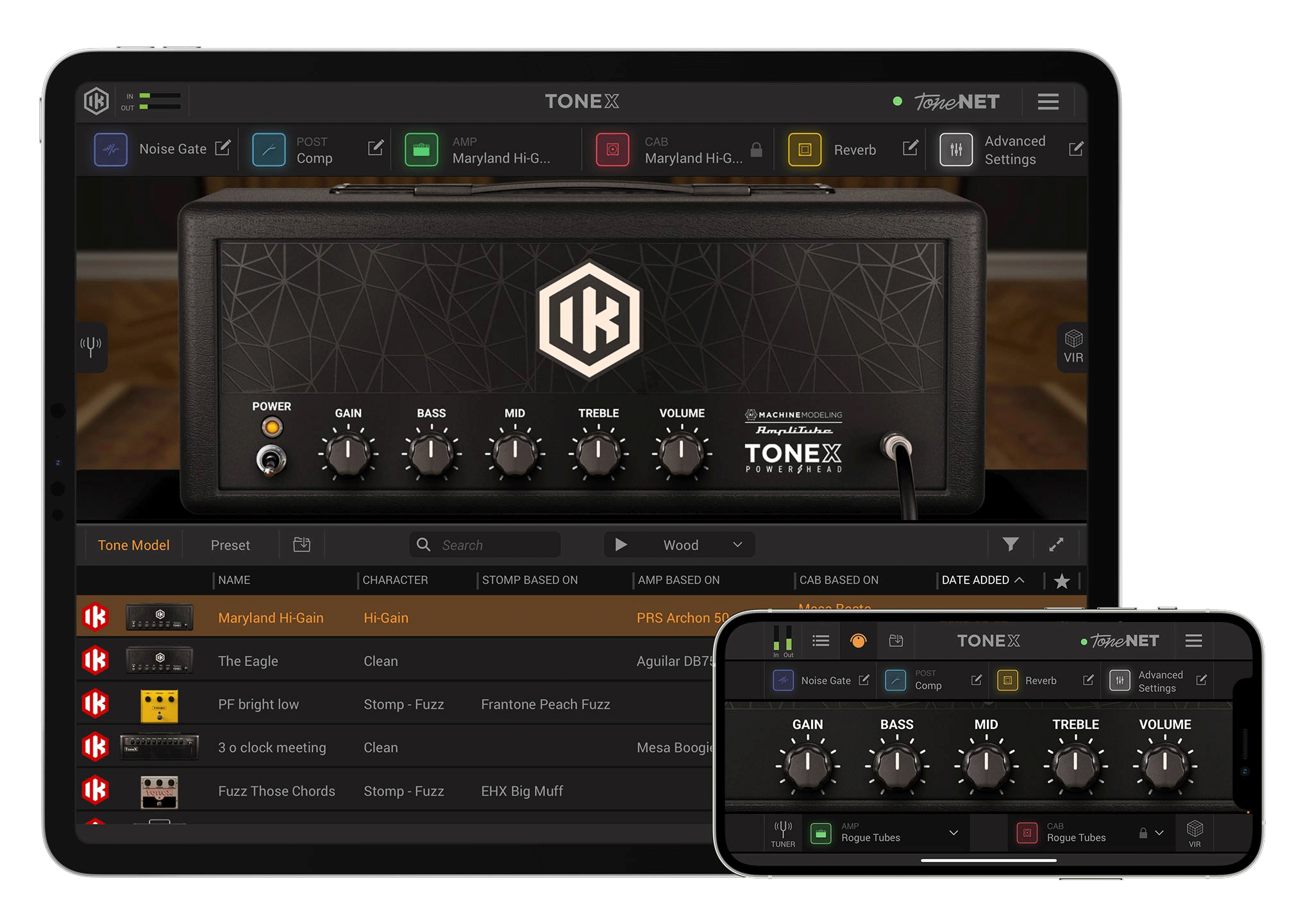 ToneModel は、AmpliTube 内のアンプ、キャビネット、ペダルと同じように機能します。所有している AmpliTube ギアと一緒に使用して、カスタム・シグナル・チェーンを構築し、プリセットとして保存して、ToneNET で共有することも可能です。