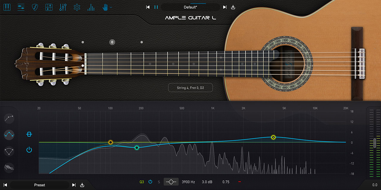 『AMPLE GUITAR L 4』は、クラシックギターを思うがままに演奏するギター音源です。Alhambra Luthier クラシックギターの各弦0フレット~20フレット(6弦~2弦は19フレット)からピック弾きと指弾きのサウンドを丹念にサンプリング。サステインやナチュラルハーモニクス、パームミュート、スライド、ハンマリング・オン/プル・オフなど、必要十分なアーティキュレーションを残響成分を含まないドライなナチュラルサウンドで収録しています。ボディ鳴りや適所で自動挿入されるフレットノイズやリリースノイズを交え、生き生きとした演奏を可能にします。