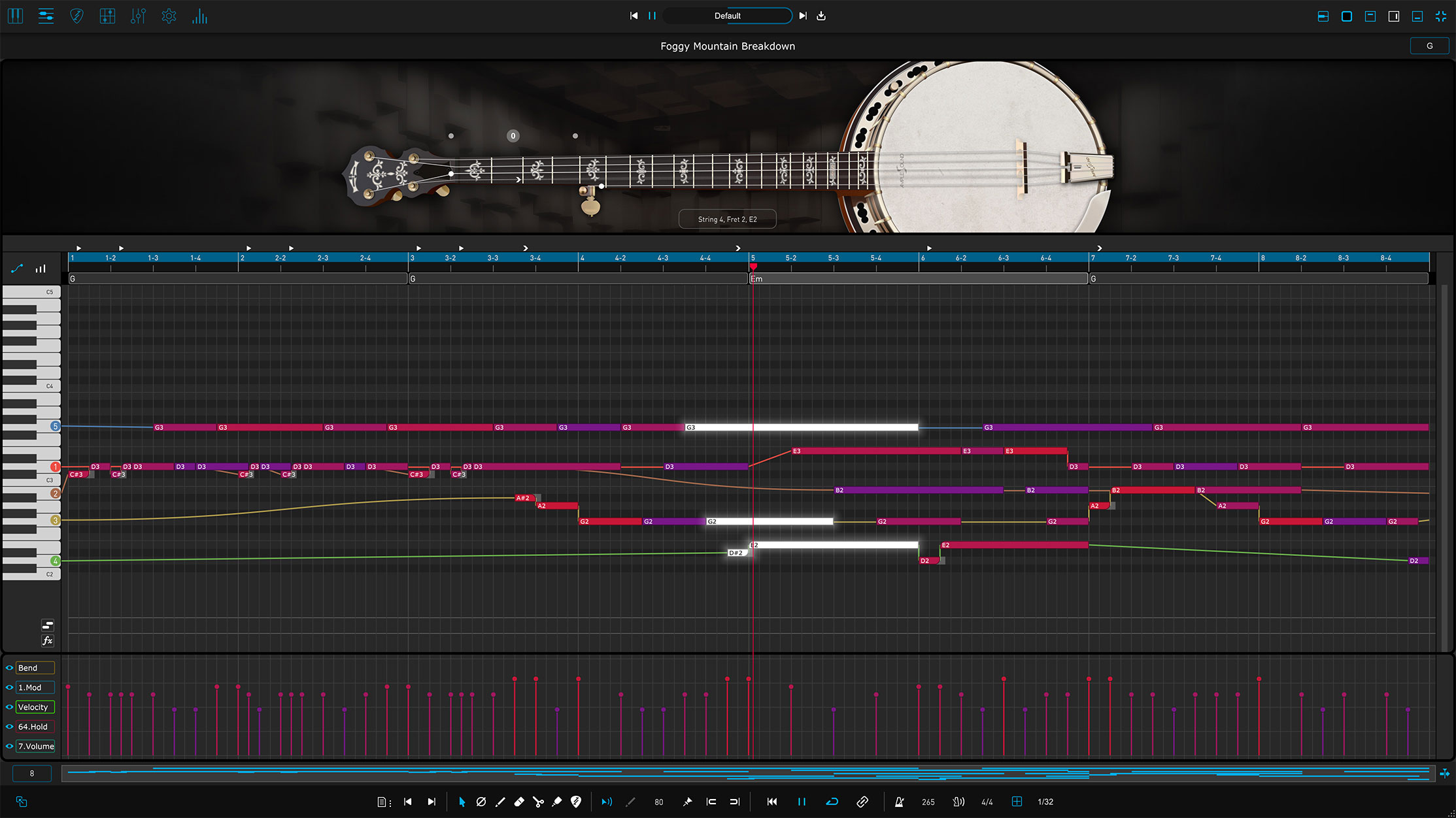 また、リフ(フレーズ)を作成する「Riffer」機能が「Riffer 4」に強化されており、ピアノロール上で演奏される弦ごとに、どのノートがどの弦で演奏されるのかイメージしながらリフをエディットすることができます。また、DAW さながらのMIDI CCやベロシティ・エディターも完備。コードやキーを指定して、ノートをまとめて転調することも可能です。ストラム作成がより直感的かつ効率的になる「Strum Note」機能によって、リフ中の和音を構成する複数のノートを1つのオブジェクトとして扱うことができ、ストラムのタイミング、ベロシティの変化、レガートといったパラメーターを一括コントロールできます。