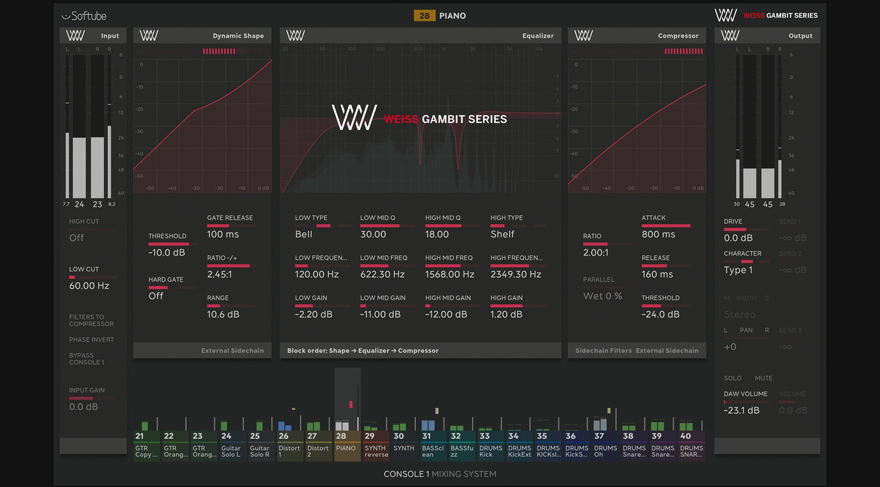 Softubeのハイブリッド・ミキシング・エコシステムConsole 1専用のアドオンであり、 Weiss DS1-MK3とWeiss EQ1の中核をなすプロセッシング要素が1つのチャンネル・ストリップに統合されています。