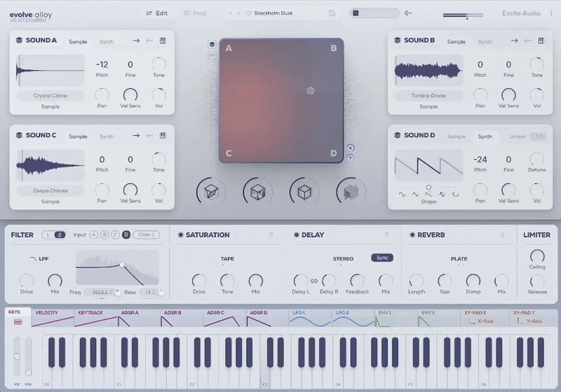 4つのレイヤーからサウンドを構築し、XYパッドで自在にブレンドが可能です。