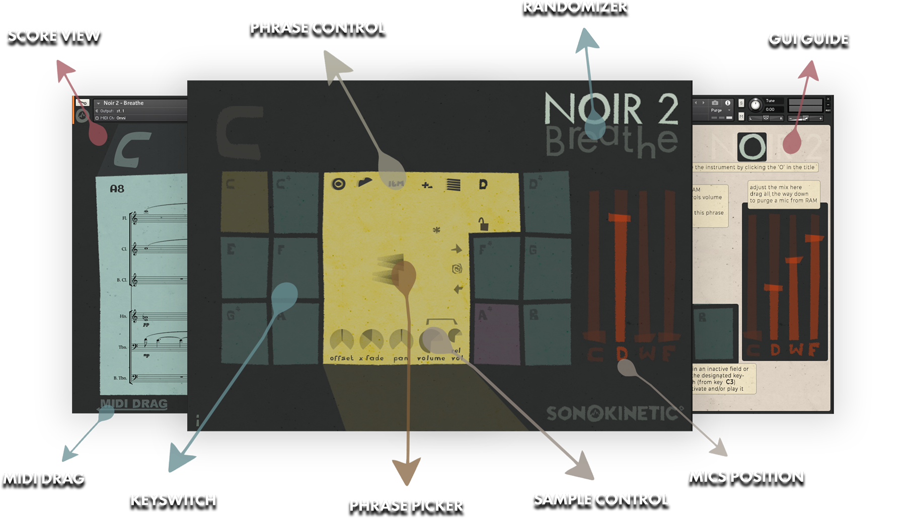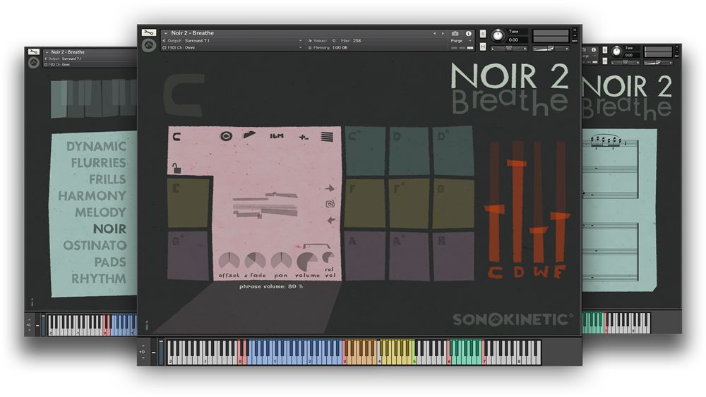 『Noir 2 - Breathe』は、金管・木管アンサンブルのフレーズを収録したKontaktライブラリです。本ライブラリは、左手でコードを指定し、右手でフレーズに対応するキーを押すことで、指定したコードに合ったフレーズが再生される、Sonokineticならではのフレーズベース音源です。収録された多数のフレーズを、独自のインターフェースで直感的に組み合わせることでダークで温かみのある雰囲気を簡単に楽曲に取り入れることができます。