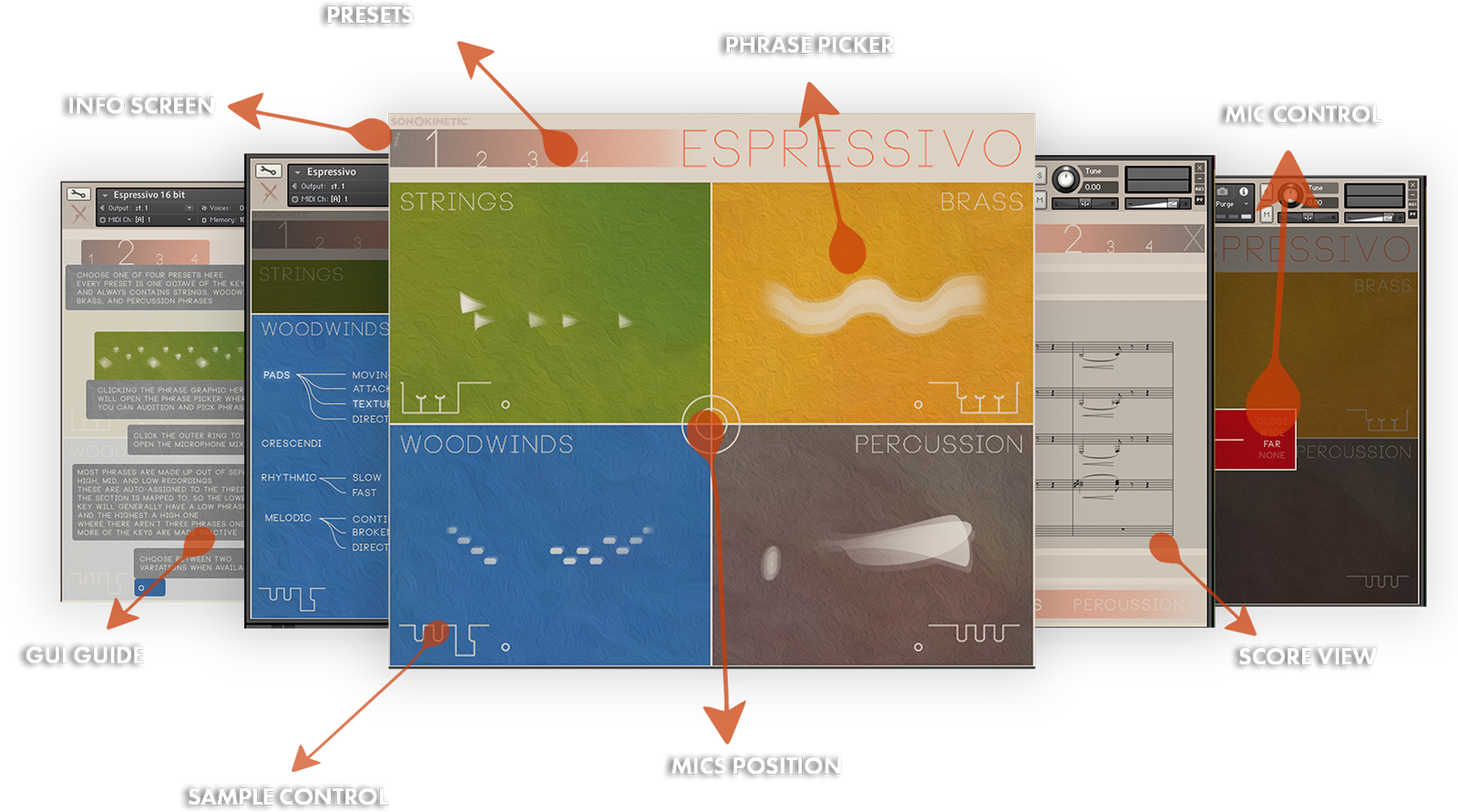 4つのプリセットには、それぞれ弦楽器、金管楽器、木管楽器、打楽器のセクションが割り当てられています。各セクションのフレーズはキーボードの特定のキーにマッピングされており、手軽にフレーズを組み合わせることが可能です。