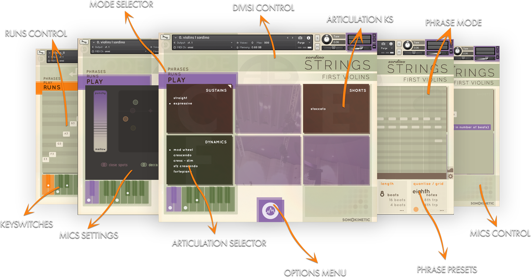 本ライブラリは、従来のマルチサンプル・ライブラリとして詳細な打ち込みを可能にする「Play」モードに加え、指定した2音間のランフレーズを生成する「Runs」モード、MIDIのインポートに対応したフレーズ・エンジンである「Phrases」モードを搭載。Sonokinetic社の長年の経験が凝縮された、柔軟性と即戦力を両立したストリングス音源です。