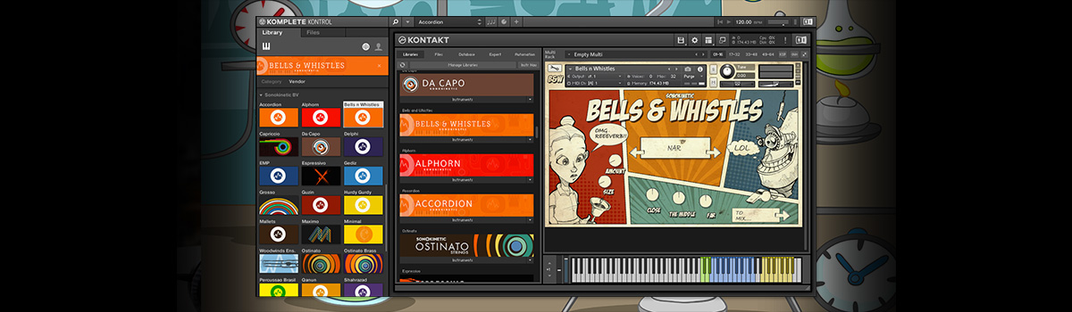 『Bells & Whistles』は、往年のカートゥーン・アニメーションにインスパイアされた、コミカルな楽器/効果音を多数収録したKontaktライブラリです。ベル、ホイッスル、ラトル、動物の鳴き声、その他のおかしな音を鳴らすおもちゃなど、ユニークな効果音が満載です。