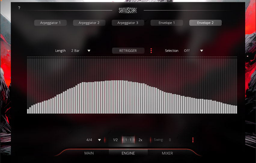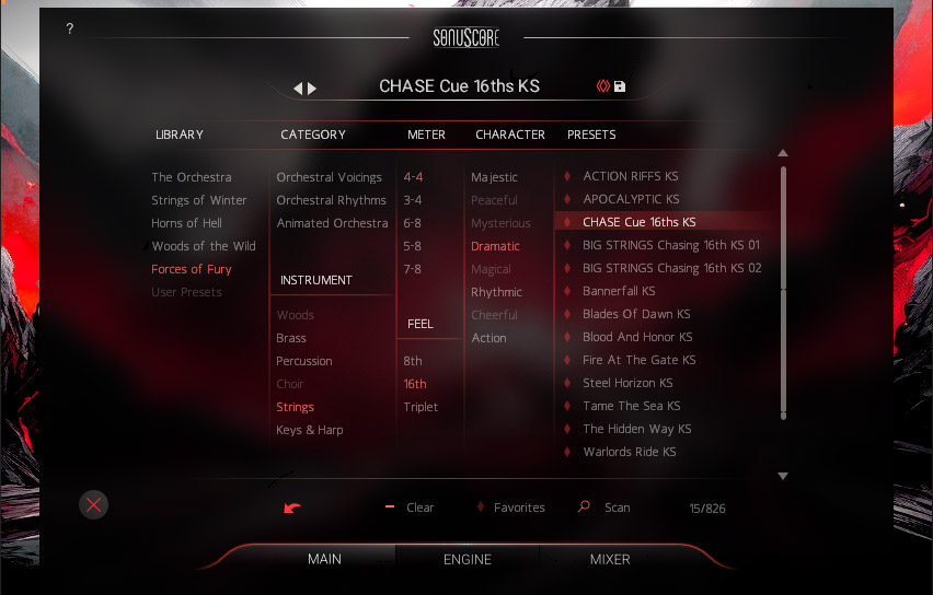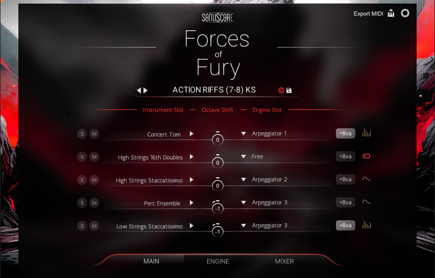 『THE ORCHESTRA』シリーズの核となっている「Ensemble Engine」を搭載しており、最大5つの楽器 / アーティキュレーションをロードして、シンプルなコードから豊かなオーケストレーション・アレンジをリアルタイムに生み出すことができます。『TO - Forces of Fury』に演奏済みのフレーズは収録されておらず、搭載されたアルペジエイターやエンベロープにより数多のフレーズを、アンサンブルを生成します。さらに、1つのプリセットにつきアルペジエイターやエンベロープの設定を最大4種類保持でき、キースイッチで設定を切り替え、演奏を展開させていくことが可能です。また、各楽器 / アーティキュレーション単体のnki も用意されています。