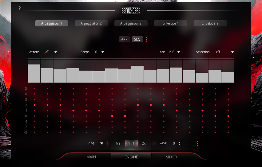 各スロットに割り当てが可能な3つのアルペジエーターと2つのベロシティ・エンベロープがあり、入力ノートをそのまま演奏するか、アルペジエイターやエンベロープを通して演奏を行うかを、スロットごとに以下3つのモードから選択します。