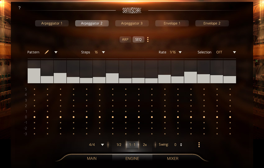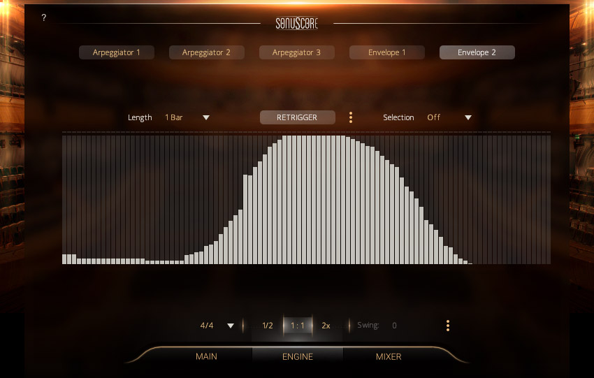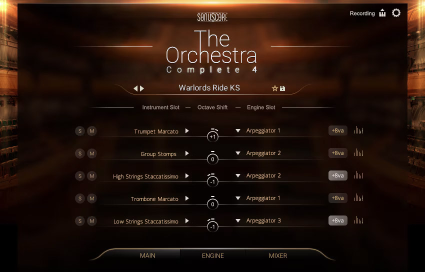『THE ORCHESTRA COMPLETE 4』の核であるEnsemble Engine(アンサンブル・エンジン)は、最大5つのスロットに個別の楽器をロードすることができ、シンプルなコードを入力するだけで、壮大なオーケストラのフレーズを作成することができます。各スロットの楽器それぞれの音量やパン、ソロ / ミュート、リバーブのセンド量などの調整を行うミキサー画面も搭載。