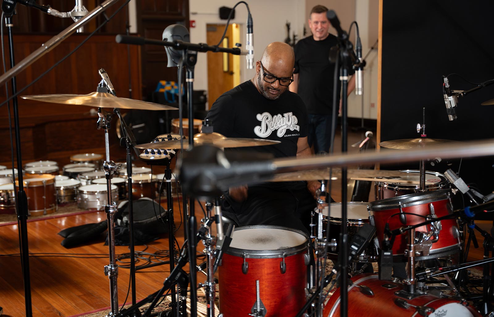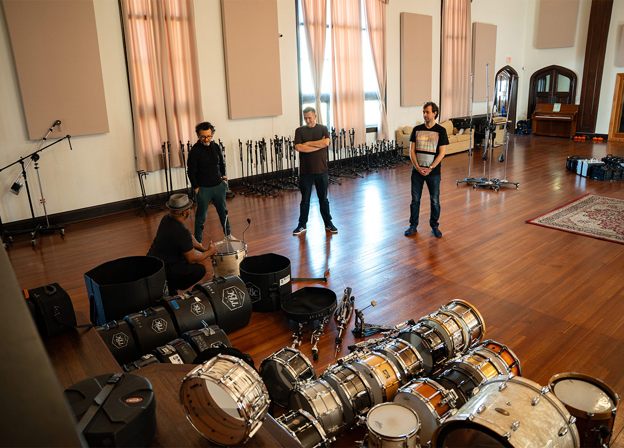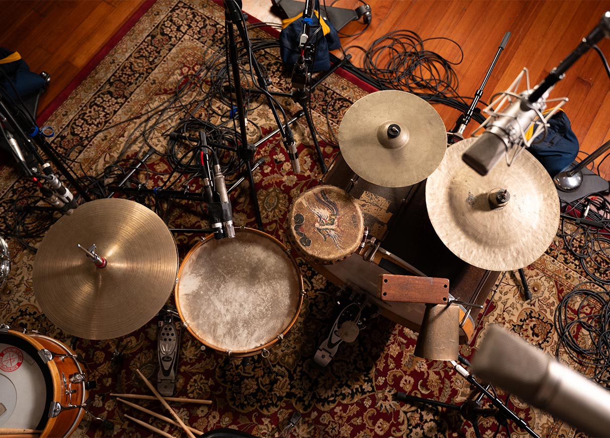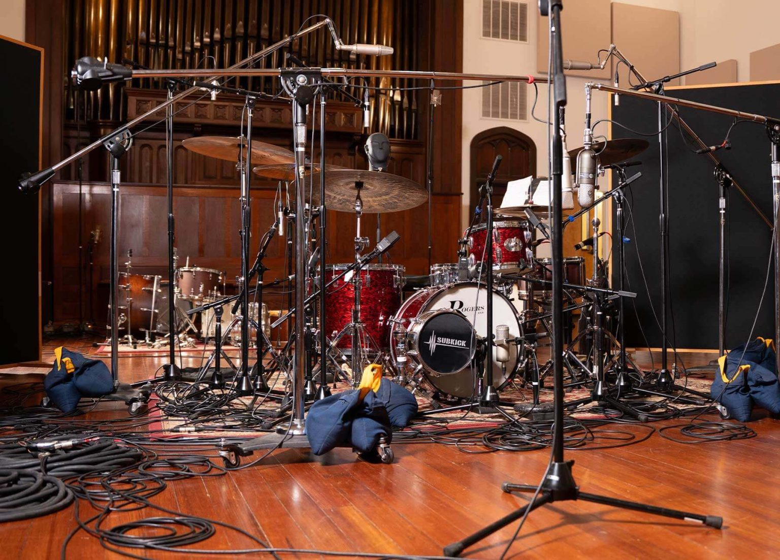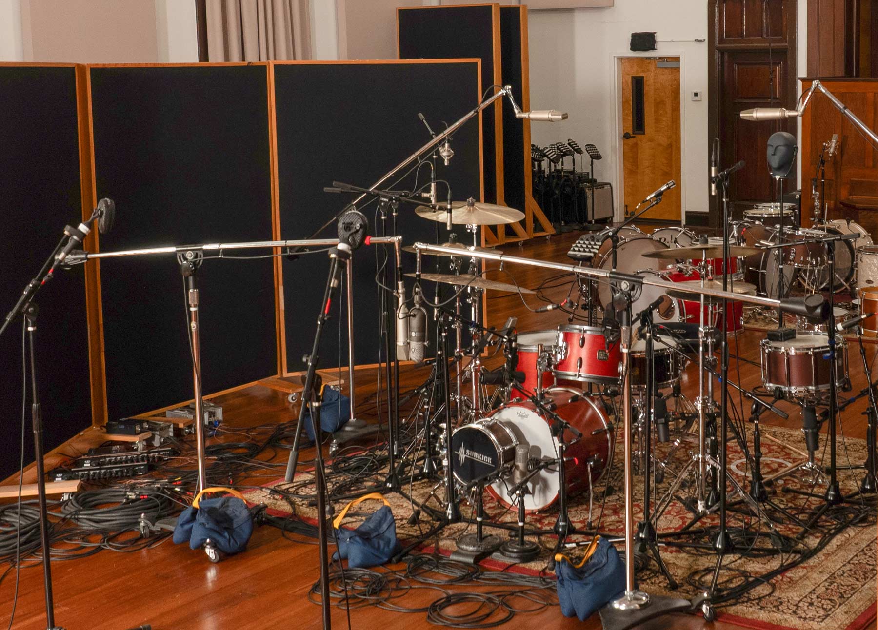 Studio Aのメインルームだけでも315平方メートル(約190畳)の広さと最大8メートルの天井を誇り、その音響はまさに圧倒的です。その一方で本作の収録ではゴボ(遮音板)を用いてドラムを部分的に仕切り、生々しくもタイトなサウンドを実現しました。