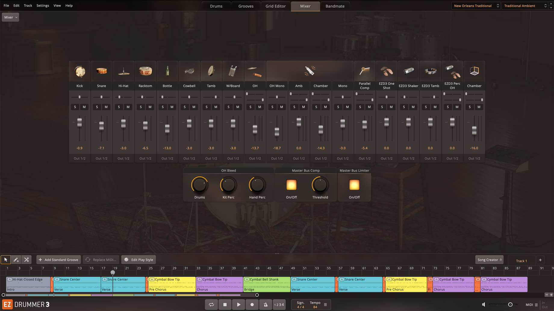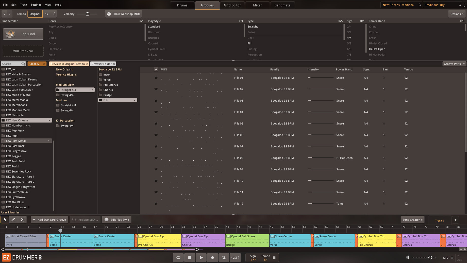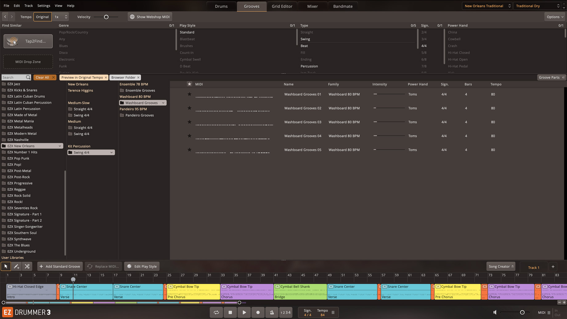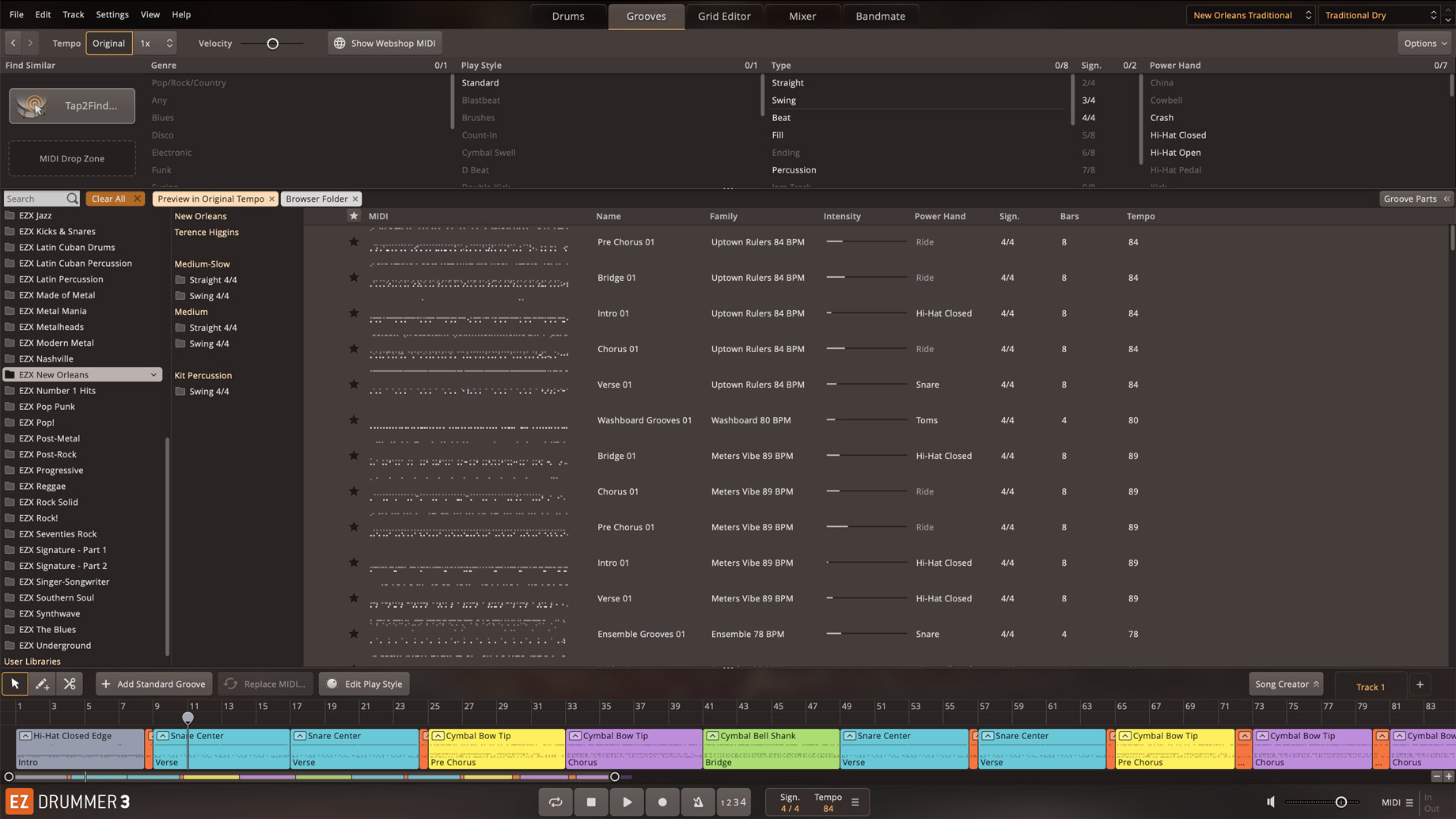 収録されているMIDIは、Terence Higgins による演奏で、ニューオーリンズ・スタイルのグルーヴを網羅しています。伝統的なジャズのパターンから、ファンキーなリズム、さらには“セカンドライン”スタイルのグルーヴまで幅広く収録しています。また、本作のパーカッションパート専用に制作されたMIDIも含まれており、ウォッシュボード、カウベル、ボトルなど、さまざまなパーカッション要素を組み合わせたグルーヴィーなビートも楽しめます。