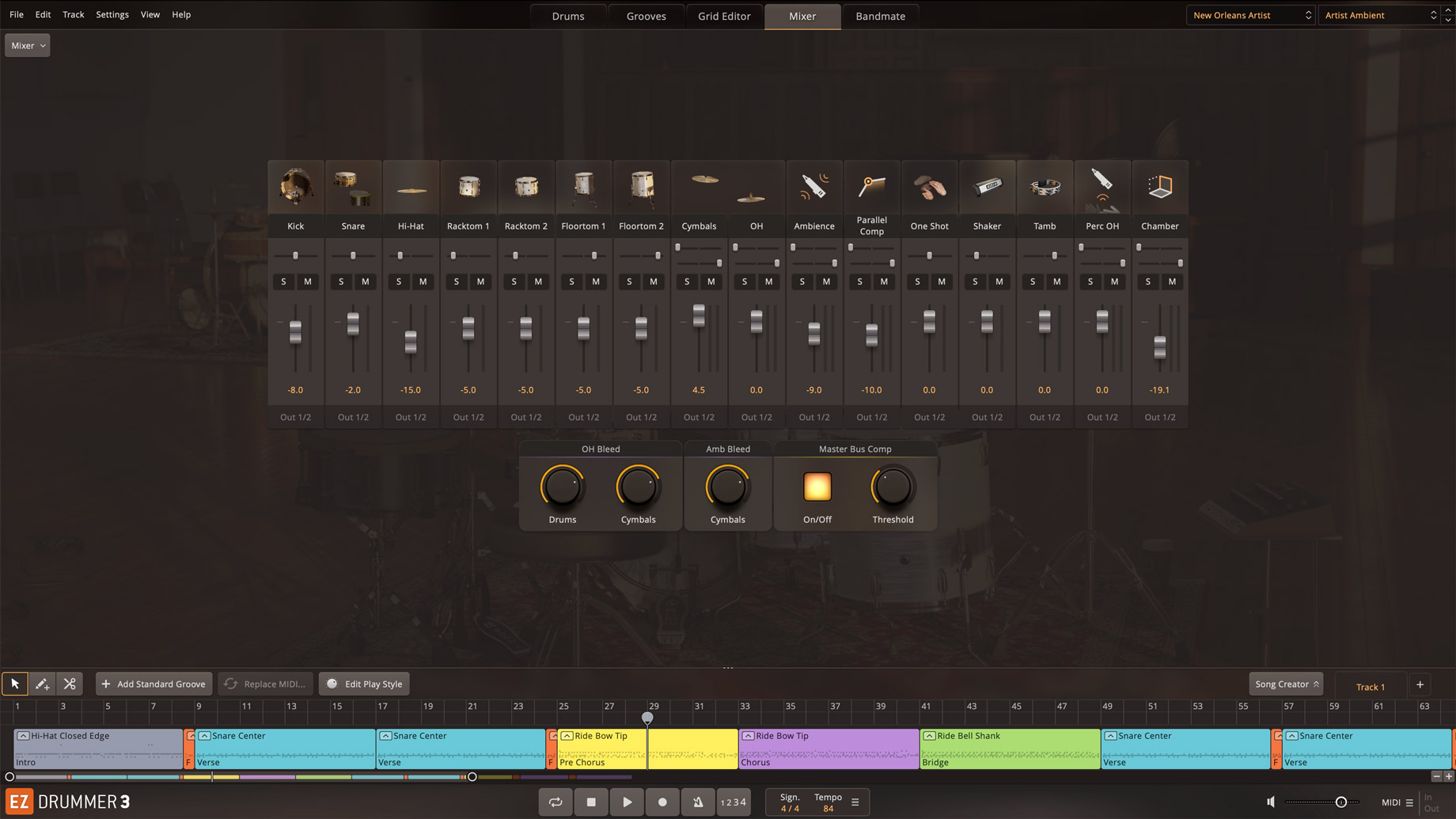 本作に収録されているプリセットは、すべて Misha Kachkachishvili によってエンジニアリングされています。各プリセットには独自のチャンネル構成とマクロコントロールが用意されており、個々の楽器の音量調整はもちろん、内部で使用されているエフェクトの設定、全体のサチュレーション量なども微調整することができます。