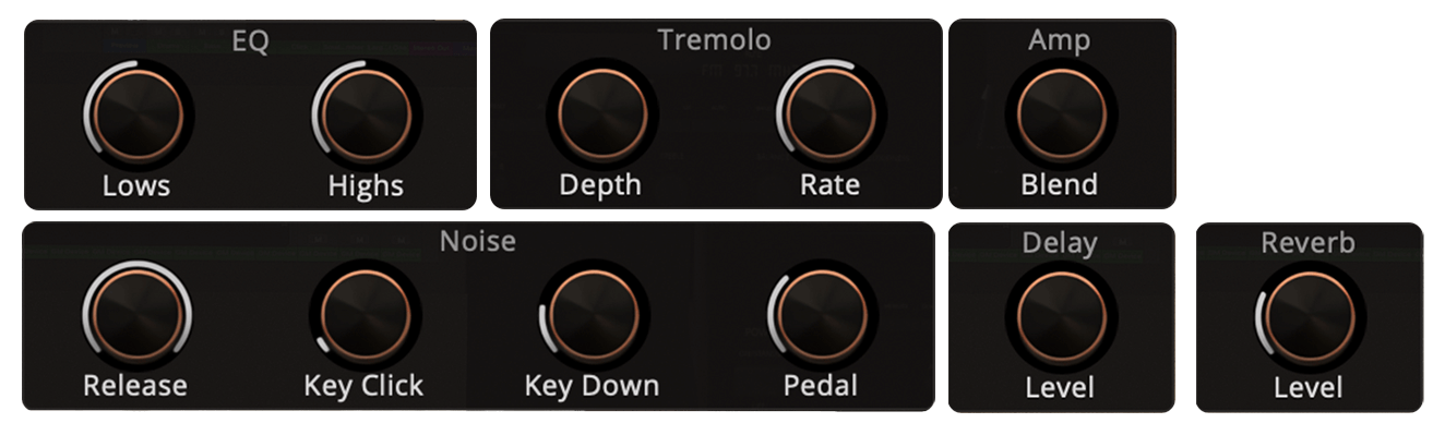 付属のプリセットではこれらのトーンがブレンドされており、トレモロ、コーラス、リバーブ、ディストーション、アンプ・モデリングなどのエフェクトが加えられています。加えて一部のプリセットにはシンセブラスやベル、アンビエンスなどのレイヤーが織り込まれており、より豊かな彩りを演出します。ドライでタイトな音色から、ウォームでスモーキーな質感まで幅広くカバーしています。