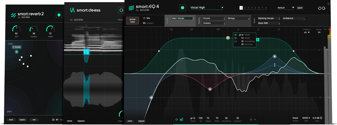 『vocal:bundle』は『smart:EQ 4』、『smart:deess』、『smart:reverb 2』をまとめた、ボーカル処理に特化したバンドルです。